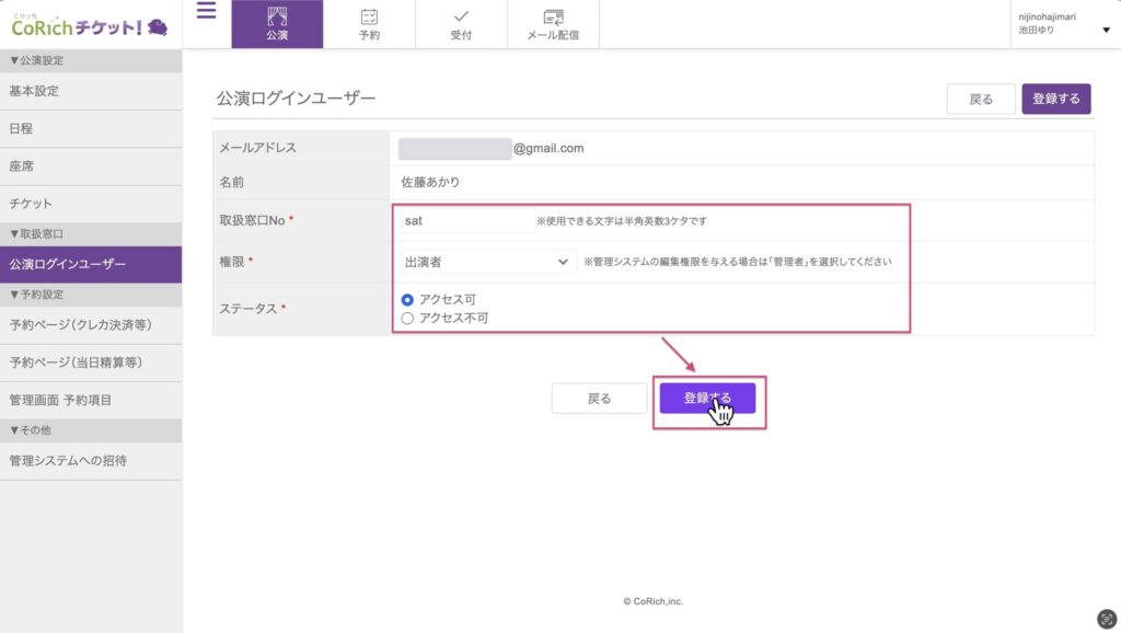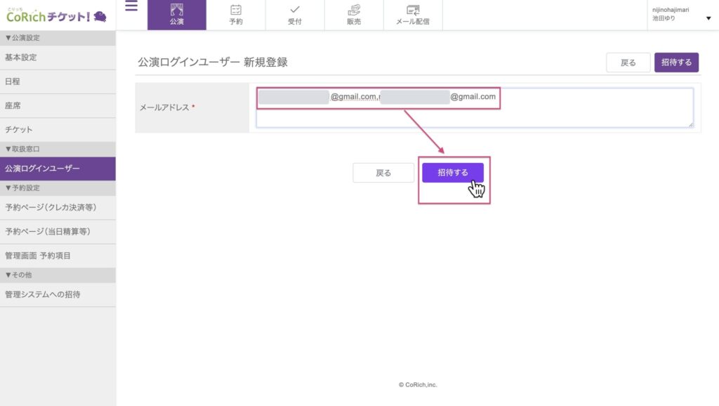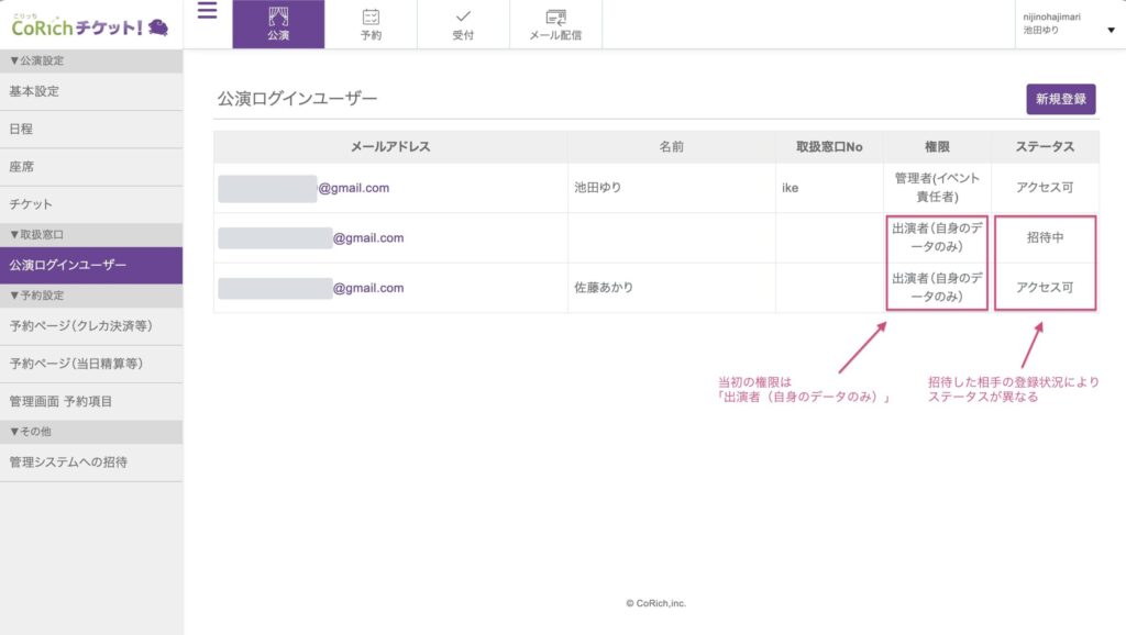 CoRichチケット!では、制作スタッフや出演者など、他のメンバーを「公演ログインユーザー」として招待し、共同で管理画面を操作することができます。