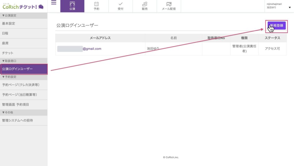 - 「公演ログインユーザー」の一覧ページが表示されたら、右上にある紫色の「新規登録」ボタンをクリックします。
